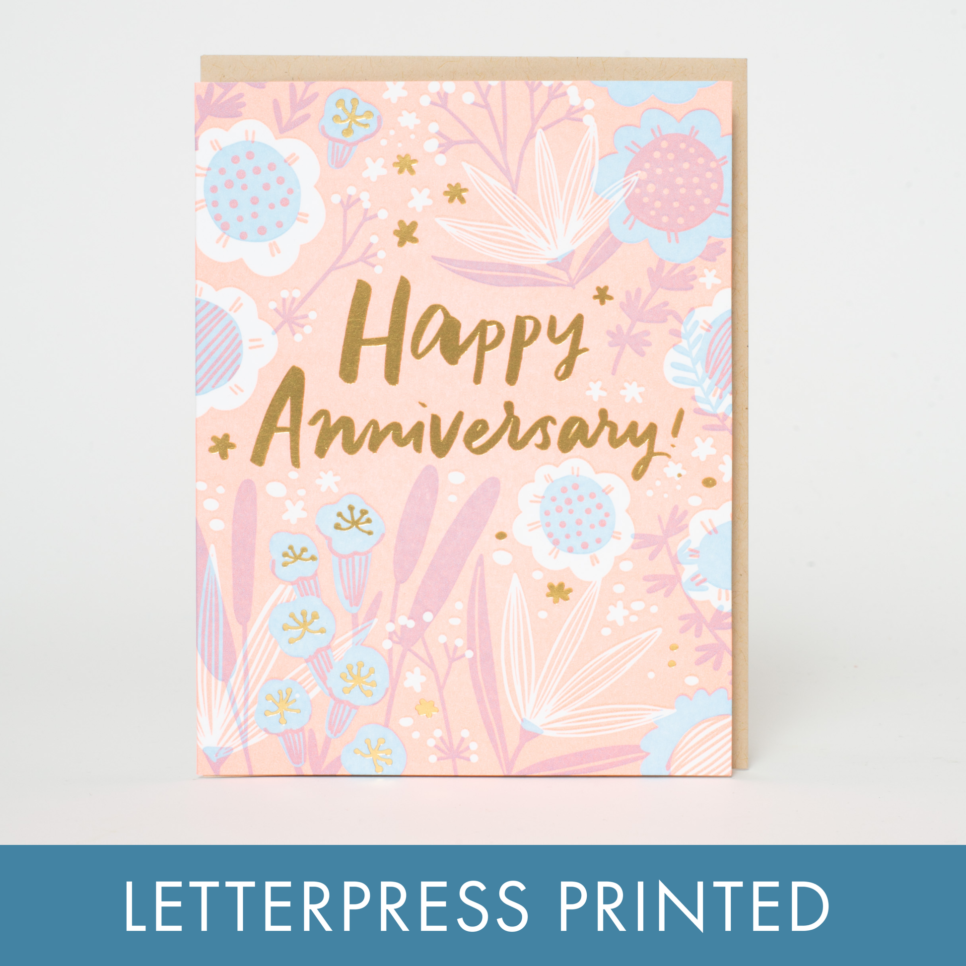 "Happy Anniversary!" All about this card: -Comes with a kraft envelope. - Gold foil accents. -Dimensions: A2 (4.25 x 5.5 inches). -Designed by Hello!Lucky in San Francisco, CA. We love to have pun! Letterpress printed by hand in Portland, Oregon.