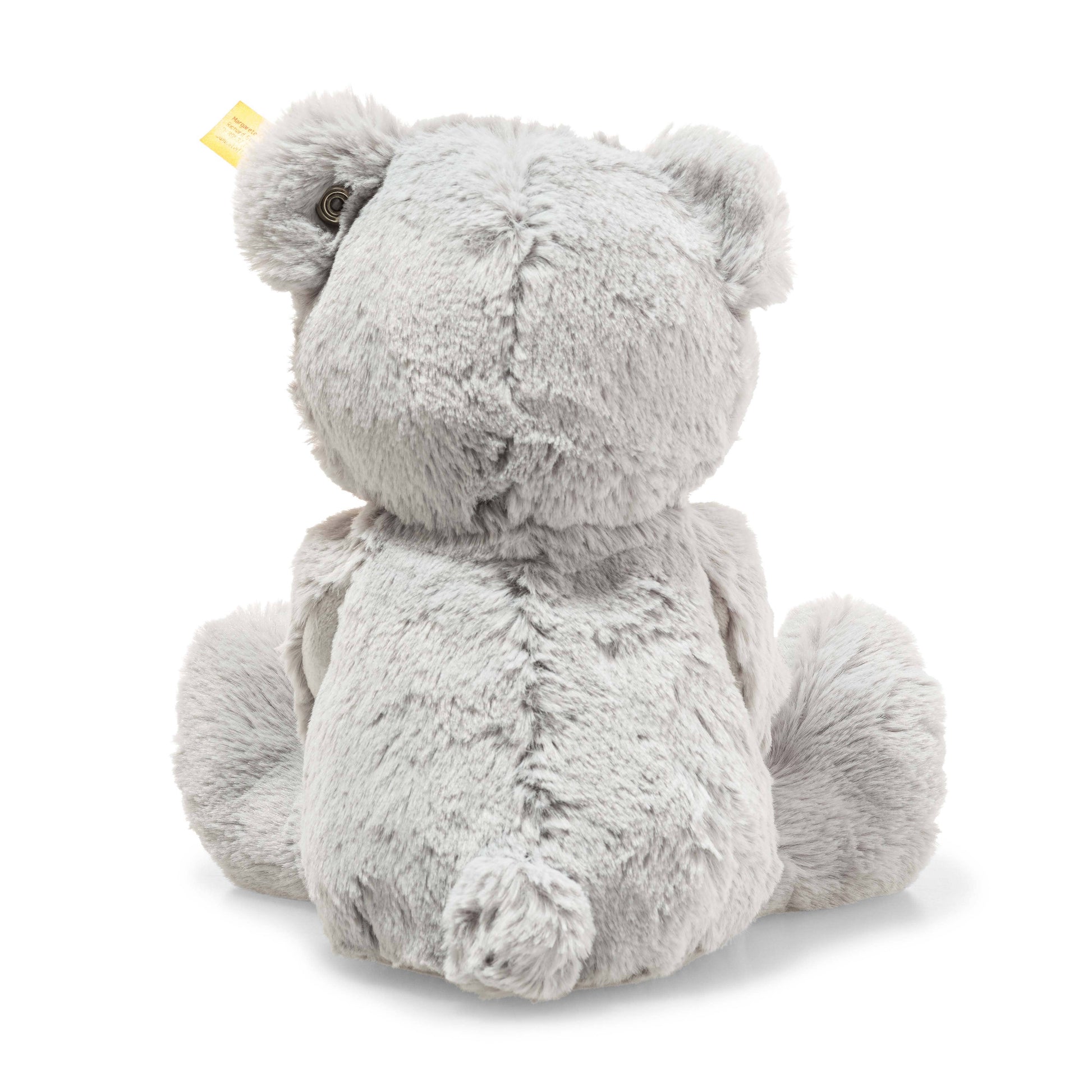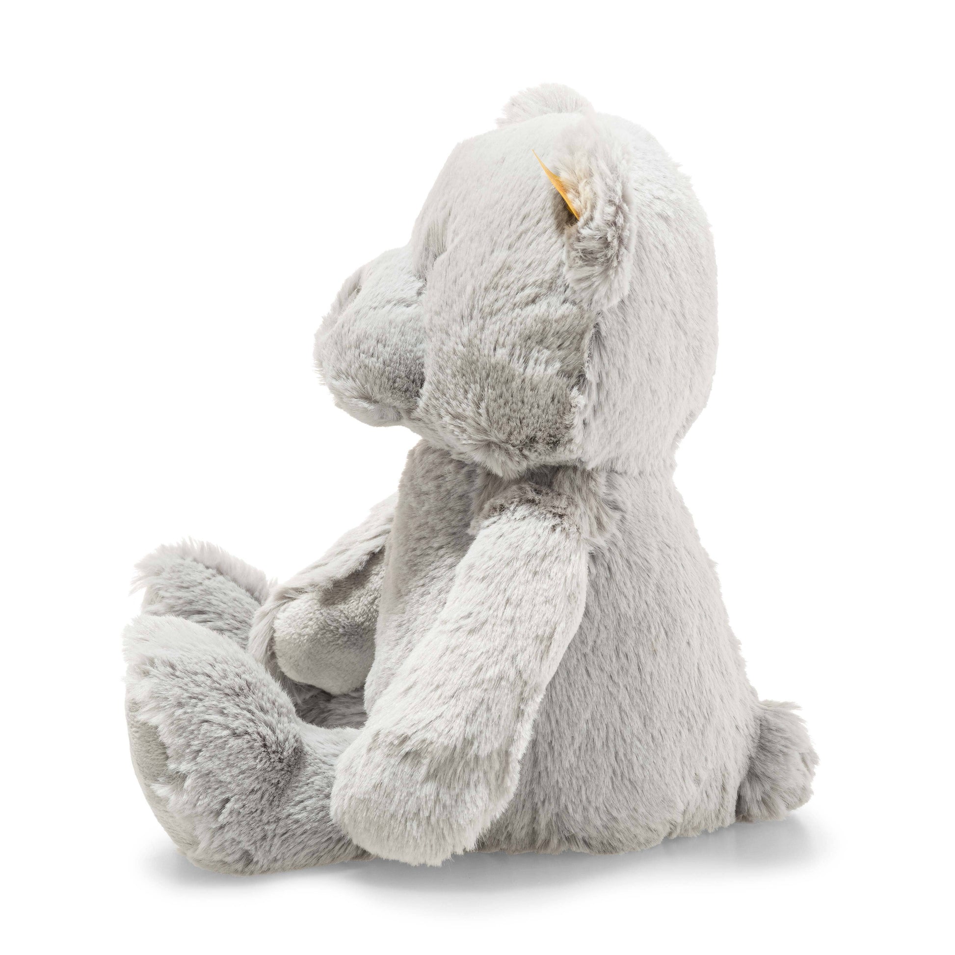 Thanks to the bean bag in his tail, Steiff's 11 inch, Bearzy teddy bear can sit beautifully next to his best friends. His eyes and nose are lovingly embroidered. The inside of his ears, arms and the paws are made of short-haired plush for baby's soft skin. The fur is made of longer ultra soft plush. The arrangement of the different surfaces invites baby to feel and touch.