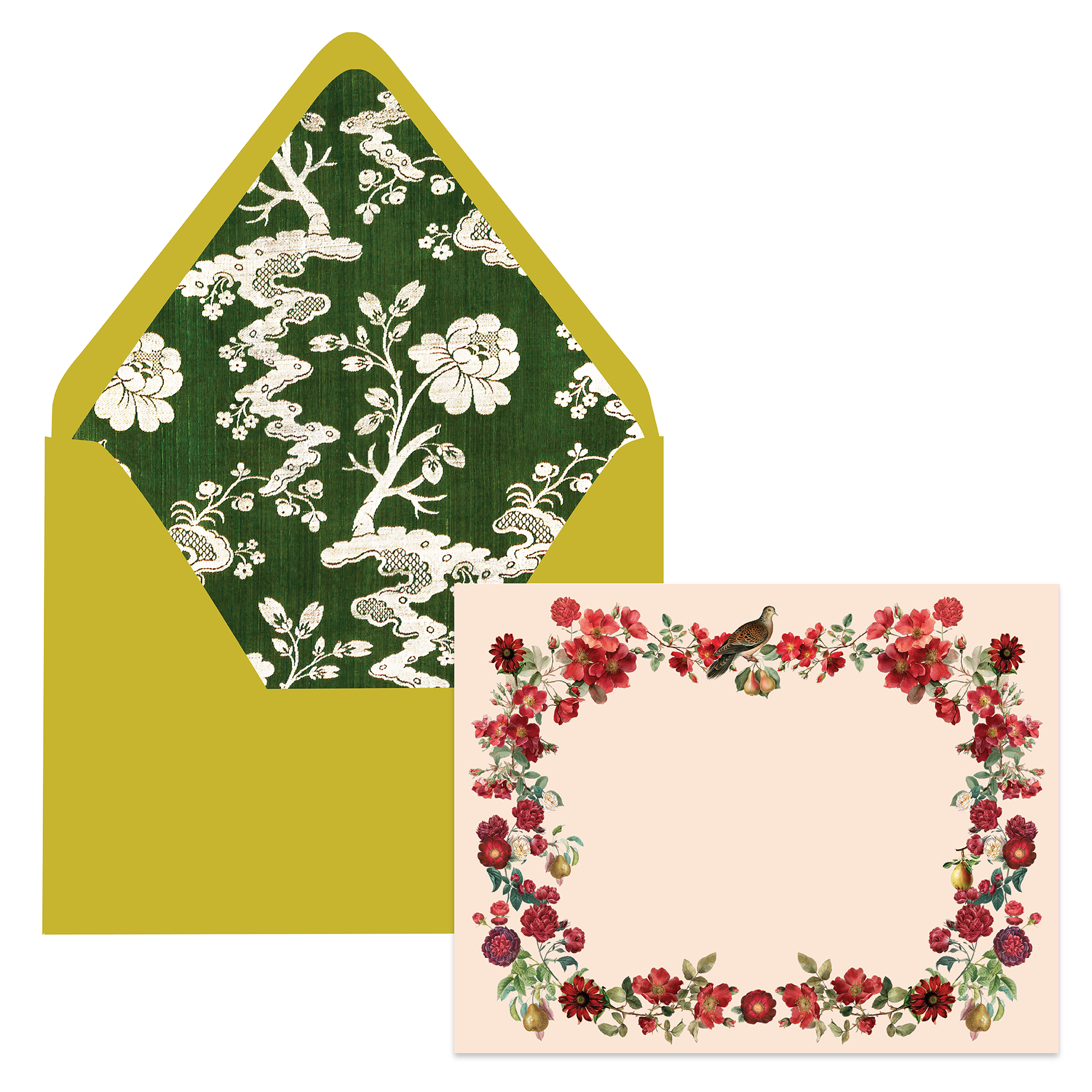 Box of 10 sets of stationery, sets include chartreuse envelopes lined with digitally printed vintage tapestry and digitally printed cards on soft peach paper. Detail uniquely collaged by the ELS studio. Sets come in acrylic box with ELS branding