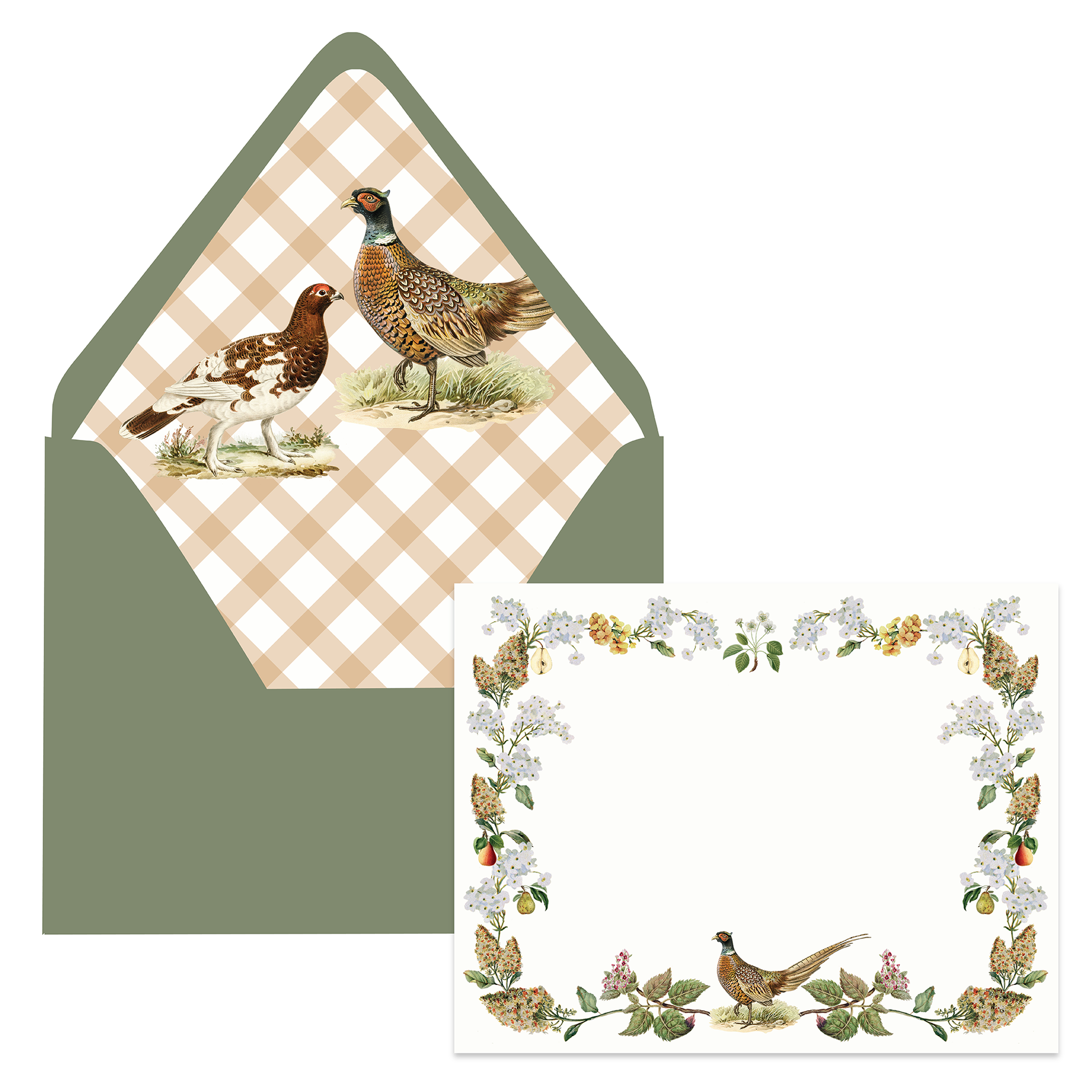 Box of 10 sets of stationery, sets include mid-green envelopes lined with digitally printed image of pheasants and digitally printed cards on soft white paper. Detail uniquely collaged by the ELS studio. Sets come in acrylic box with ELS branding
