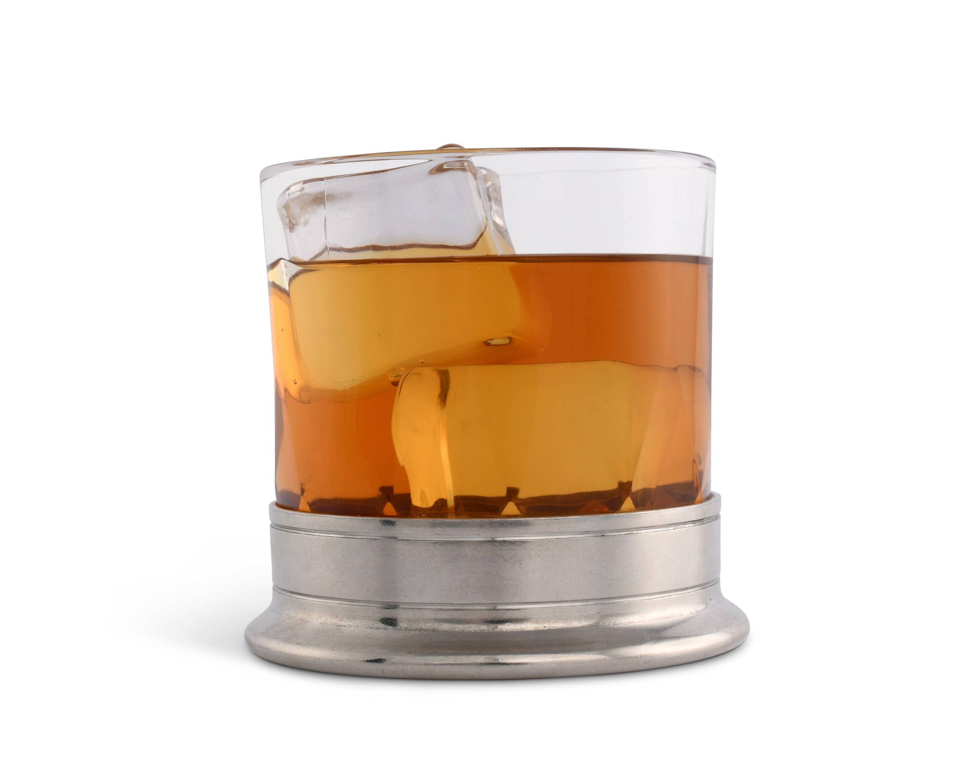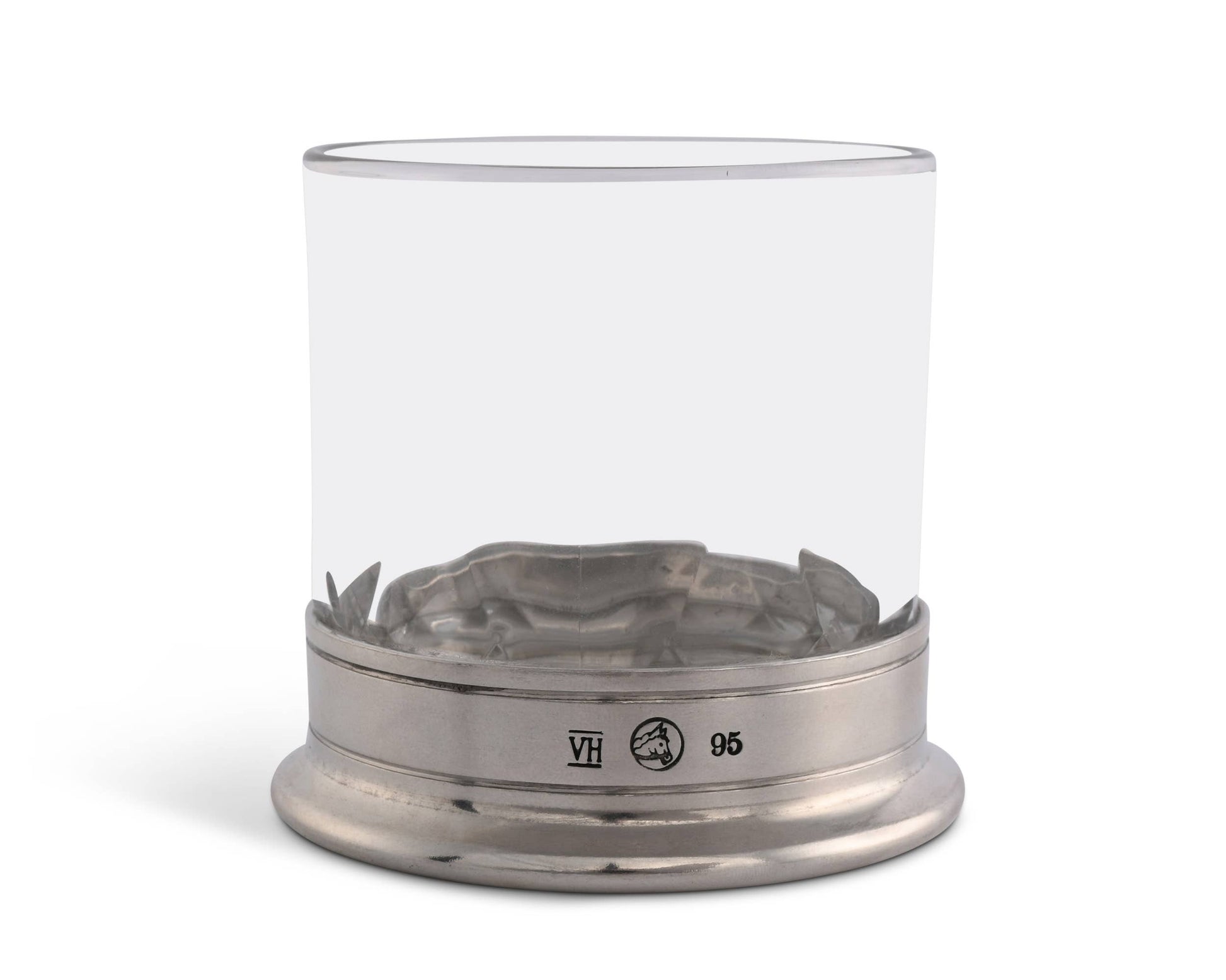 Enhance your scotch drinking experience with a lowball glass that stands for your taste and style. Our whiskey glass features a hatched pattern and a pewter base bottom with an engraved horse. Ideal for adding an opulent accent to your equestrian lifestyle. Handcrafted by our artisans at Vagabond House, these luxurious scotch glasses have a pewter base that adds sturdiness, making these shatterproof drinking glasses last a lifetime. Perfect to add an elegant character to your drinking experience. Size: 3.75"W x 3.5"T Care: Dishwasher Safe with low heat and non acidic detergent