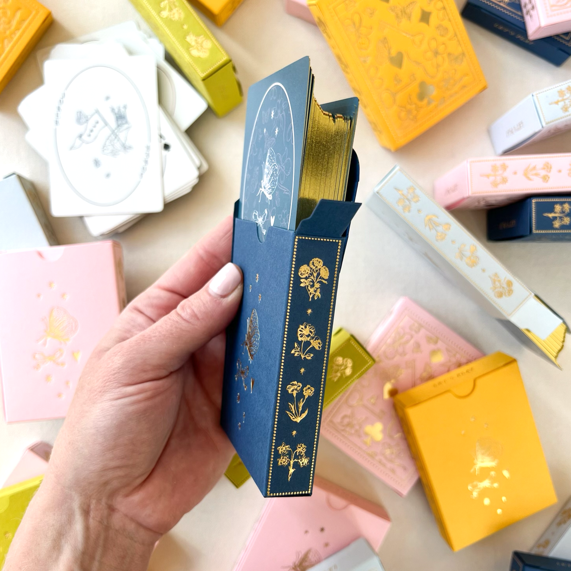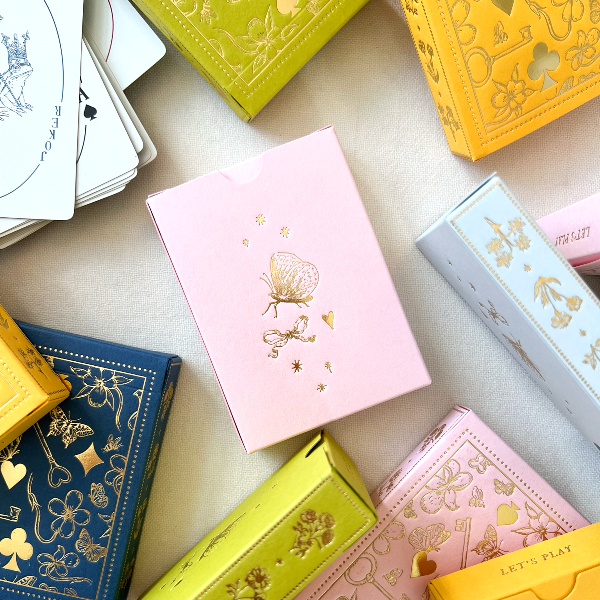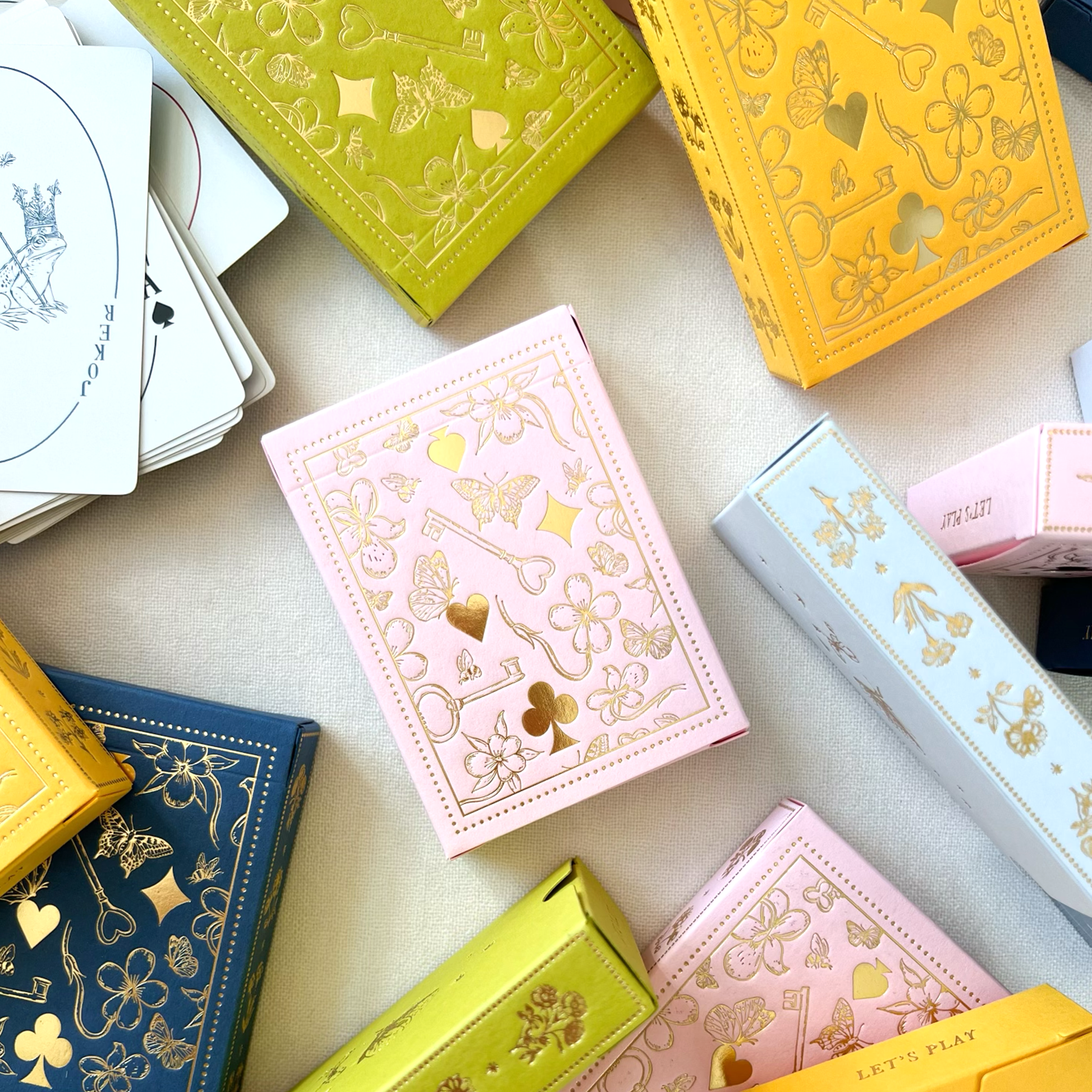 The Every Little Something deck of cards features hand drawn details across 54 unique cards. Deck of cards features gold gilded edges and a gold foil pressed box in our choice of color.