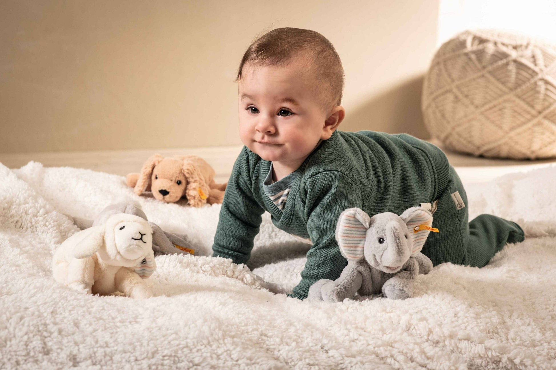 Steiff's Little Floppies Collection of loosely constructed and lightly stuffed animals has been a favorite for nearly 15 years. Now we're updating this beloved series with new designs featuring our best-selling furry friends. Our beautiful little lamb called Linda is handmade from a luxuriously soft fabric. She has a sweet face, stitched nose and mouth, and shiny black eyes.