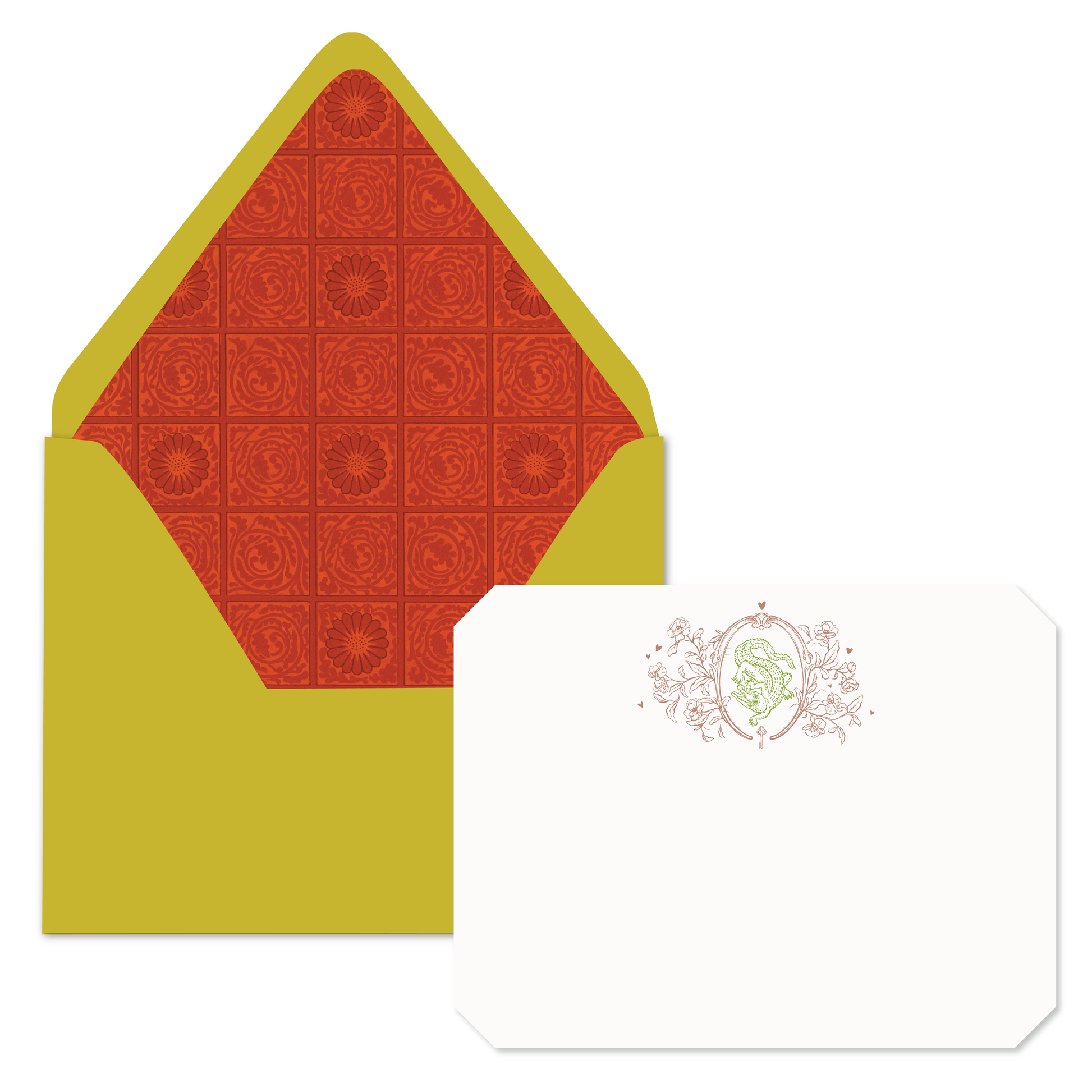 Box of 10 sets of stationery, sets include chartreuse envelopes lined with digitally printed pattern liner and foil printed cards on pearl white paper. Hand drawn alligator and floral crest detail is foil stamped in metallic copper and green foil.