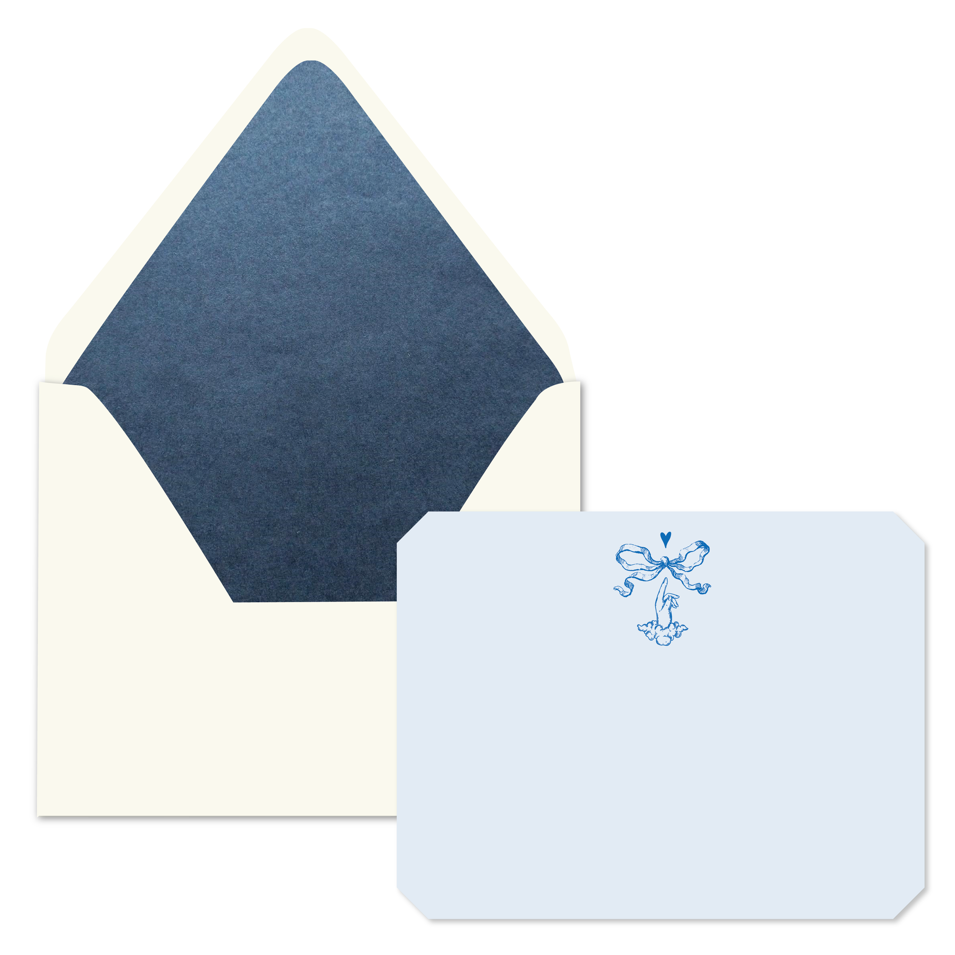 Box of 10 sets of stationery, sets include natural envelopes lined with hand-made tissue paper liners and foil printed cards on soft blue paper. Hand drawn bow, hand and heart detail is foil stamped in metallic navy foil.