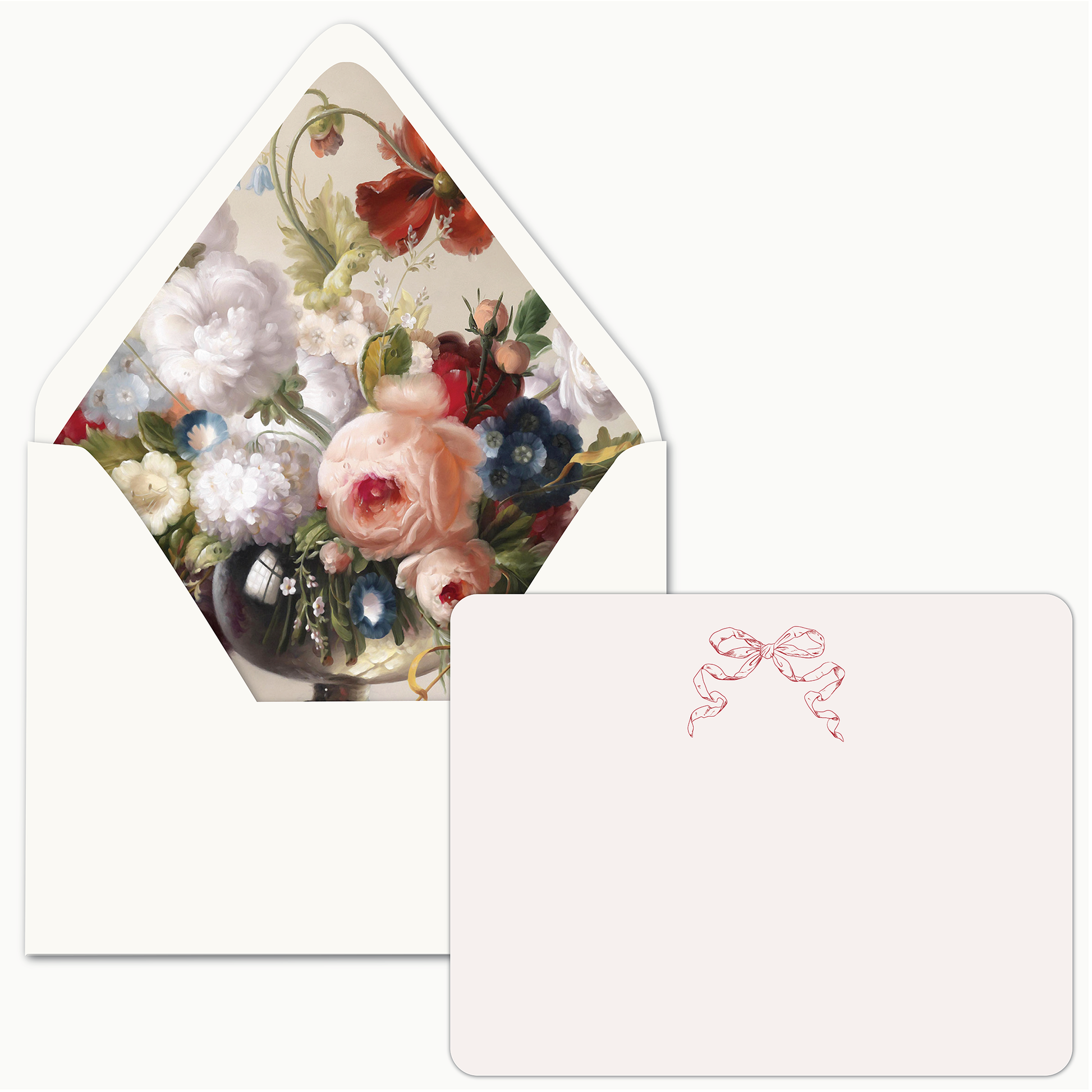 Box of 10 sets of stationery, sets include soft white envelopes lined with digitally printed fine art liner and foil printed cards on soft pink paper. Hand drawn bow detail is foil stamped in metallic red foil.