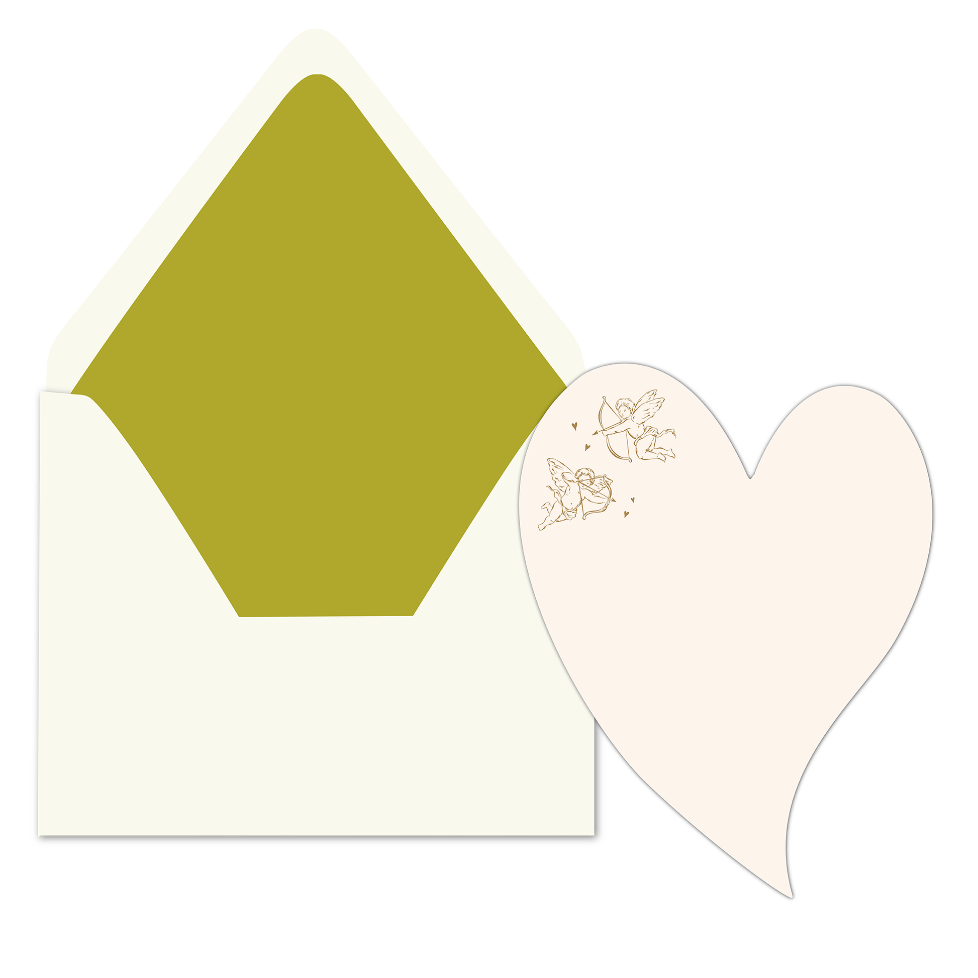 Box of 10 sets of stationery, sets include warm white envelopes lined with chartreuse paper liner and foil printed cards on soft pink paper die cut into a heart shape. Hand drawn cherubs and hearts is foil stamped in metallic gold foil.