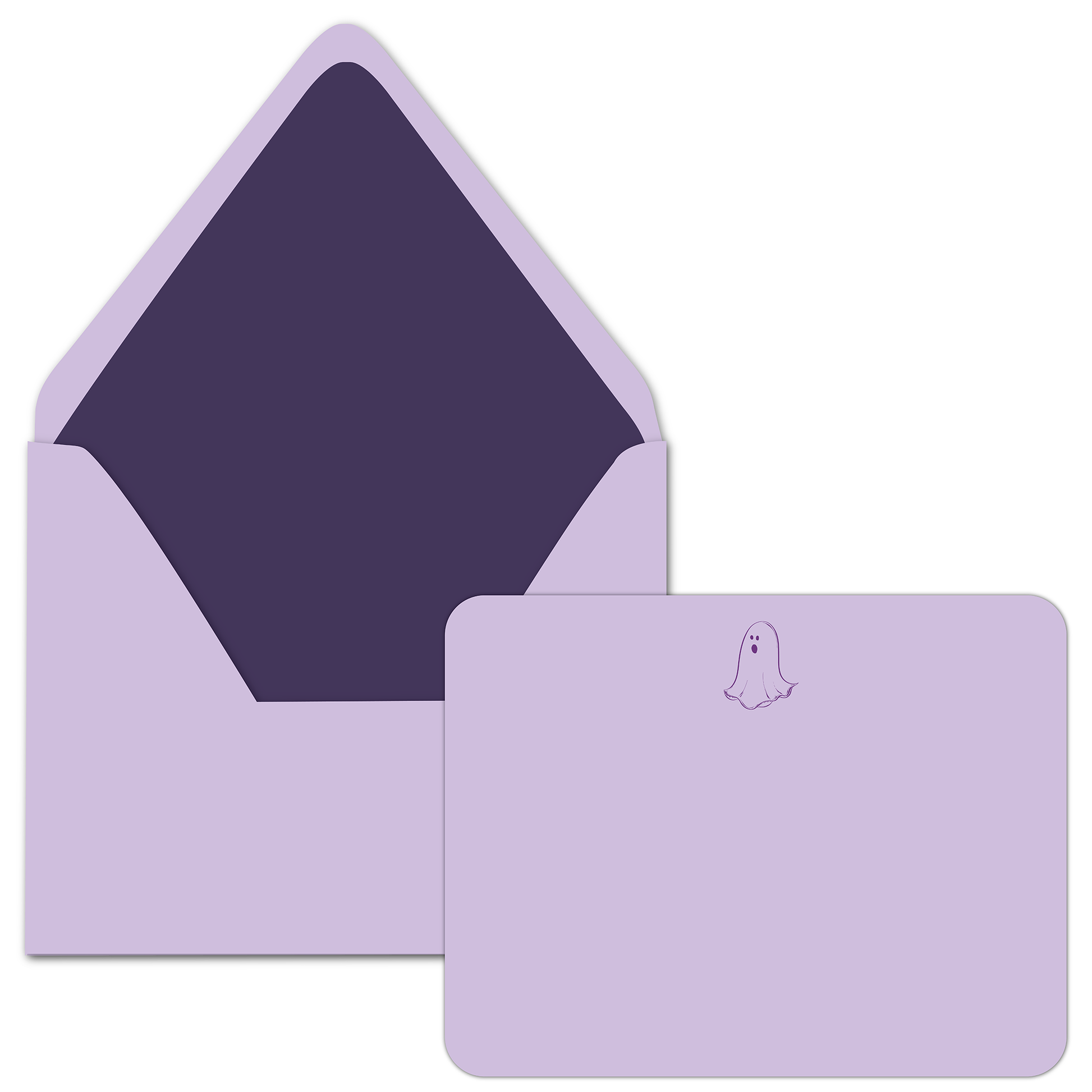 Box of 10 sets of stationery, sets include purple envelopes lined with a deep purple paper liner and foil printed cards on purple paper. Hand drawn happy ghost detail is foil stamped in metallic purple foil.