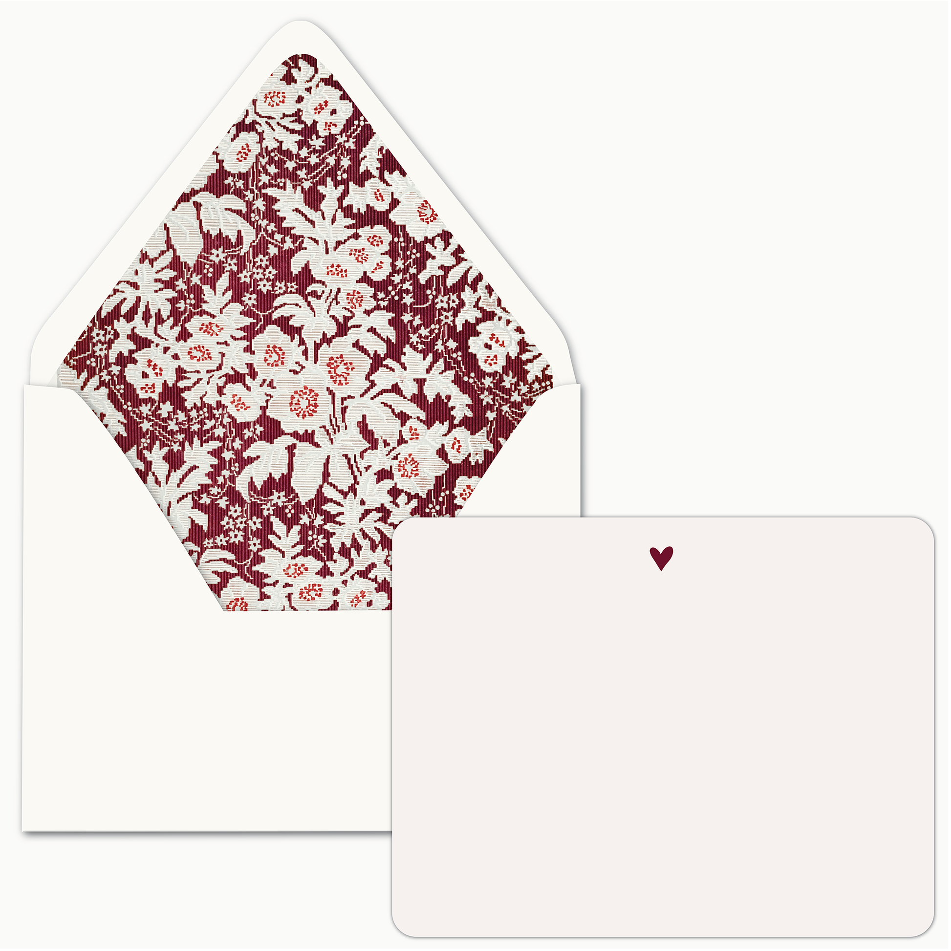 Box of 10 sets of stationery, sets include soft white envelopes lined with digitally printed fine art liner and foil printed cards on soft pink paper. Hand drawn heart detail is foil stamped in metallic maroon foil.