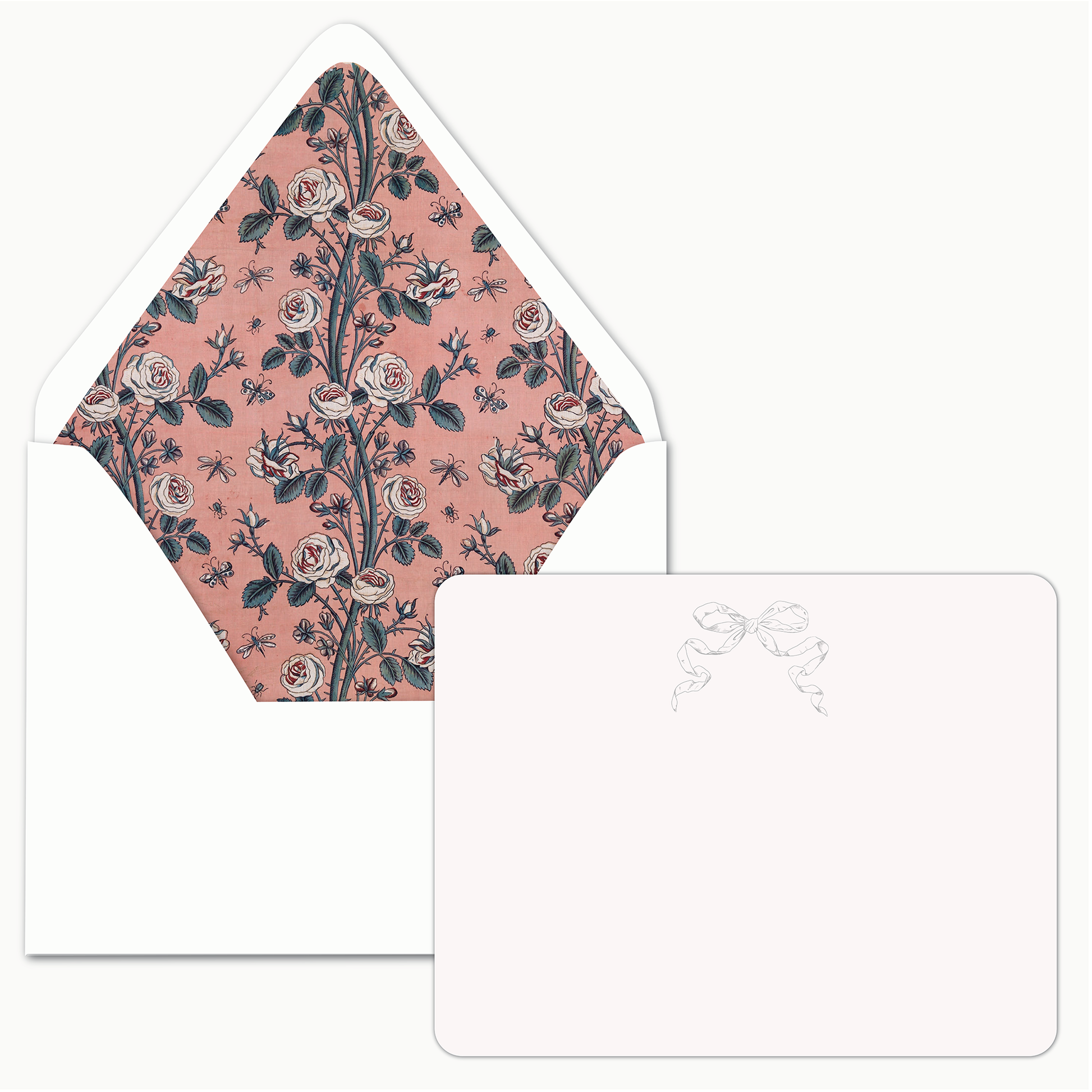 Box of 10 sets of stationery, sets include soft white envelopes lined with vintage flower liner and foil printed cards on soft pink paper. Hand drawn bow detail is foil stamped in metallic silver foil.