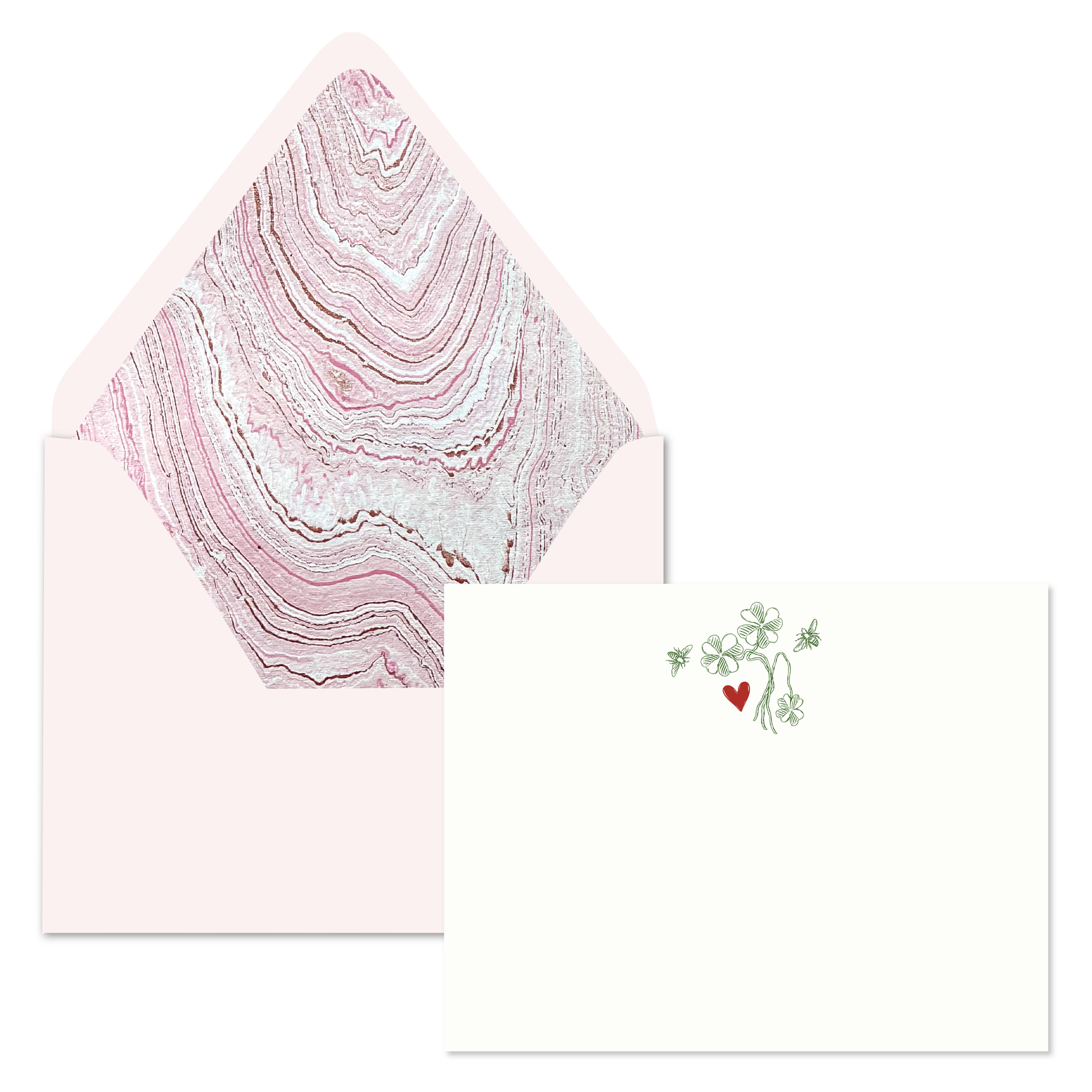 Box of 10 sets of stationery, sets include light pink envelopes lined with hand marbled paper liners and foil printed cards on double thick pearl white paper with rose gold gilded edges. Hand drawn clover detail is foil stamped in metallic green and red foil.