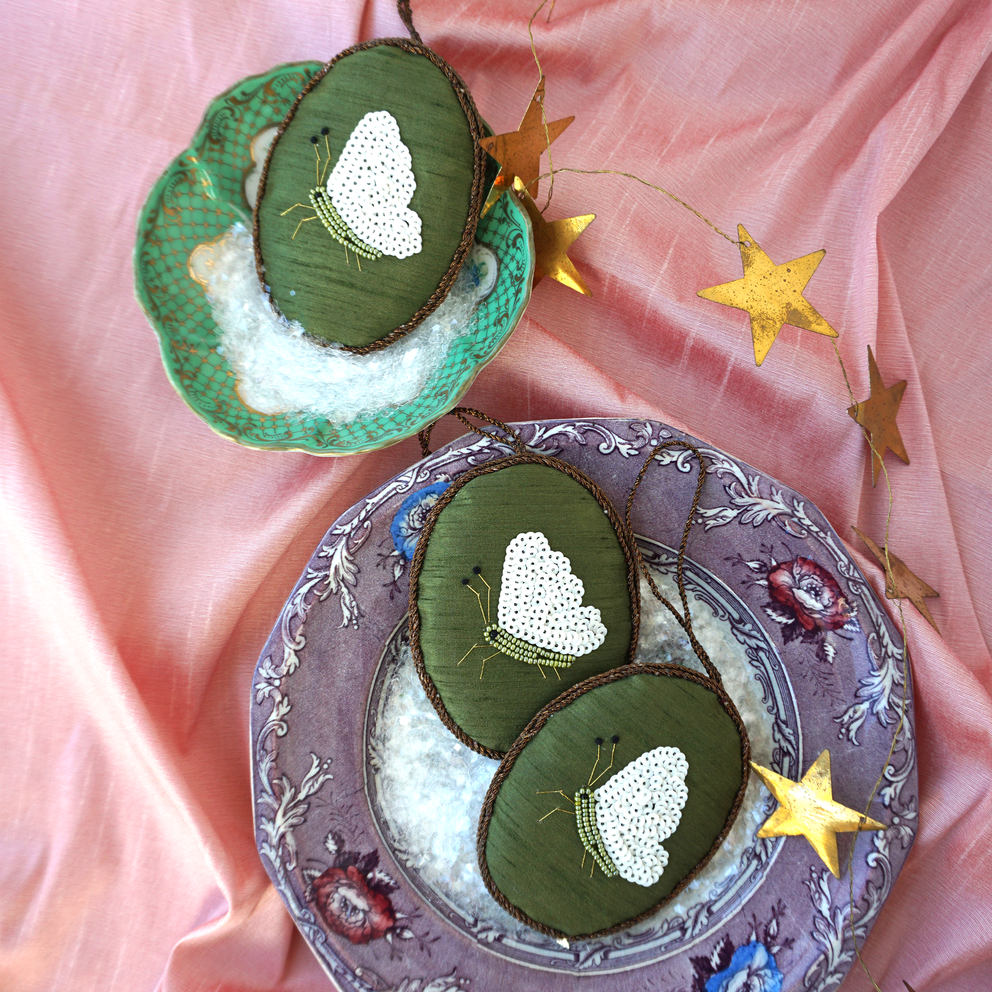 Silk oval, iridescent beads and sequin, metallic ribbon loop
