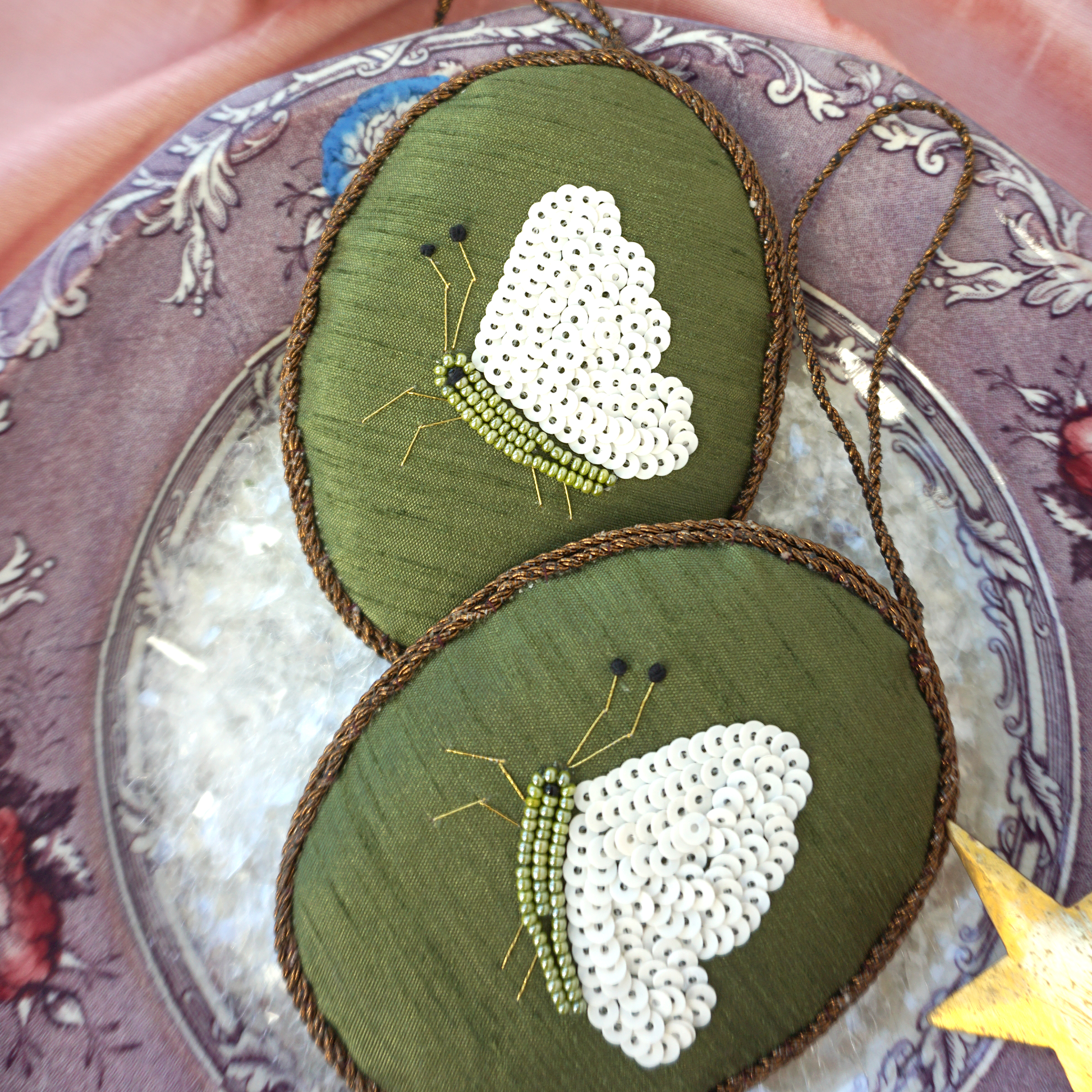 Add a touch of elegance to your holiday decor with our beautifully beaded ornaments. These hand-beaded, dupioni silk oval ornaments feature iridescent sequins and beads, giving them a unique and stunning look. Perfect for your tree, as a gift, or as a stocking stuffer. Each ornament is individually crafted, ensuring a one-of-a-kind piece for your collection.