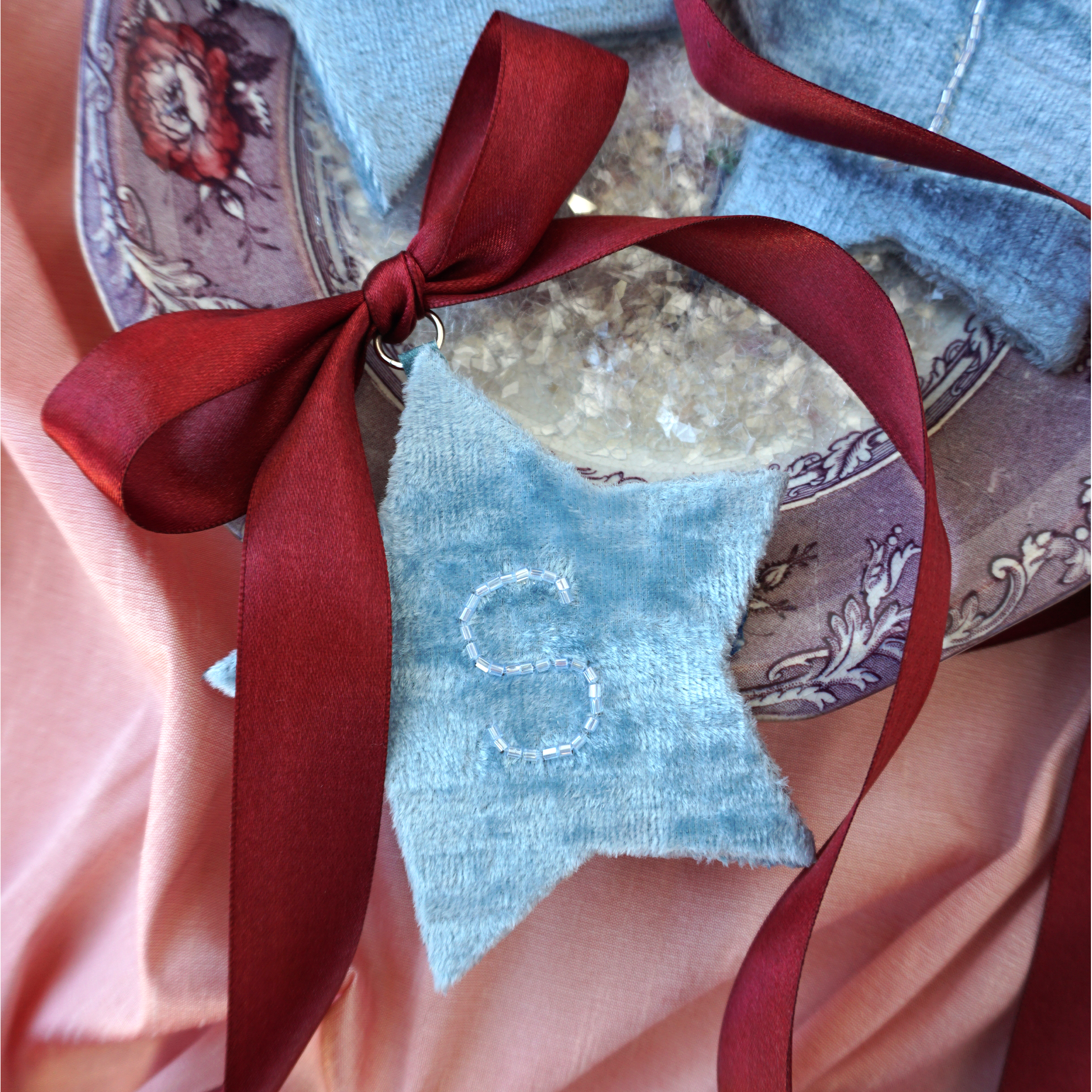 This hand beaded velvet ornament features a beautiful wine satin ribbon for easy hanging on your tree, stocking, or gift. Each star is unique, adding a touch of one-of-a-kind elegance to your holiday decor. Elevate your holiday with these heirloom letters.