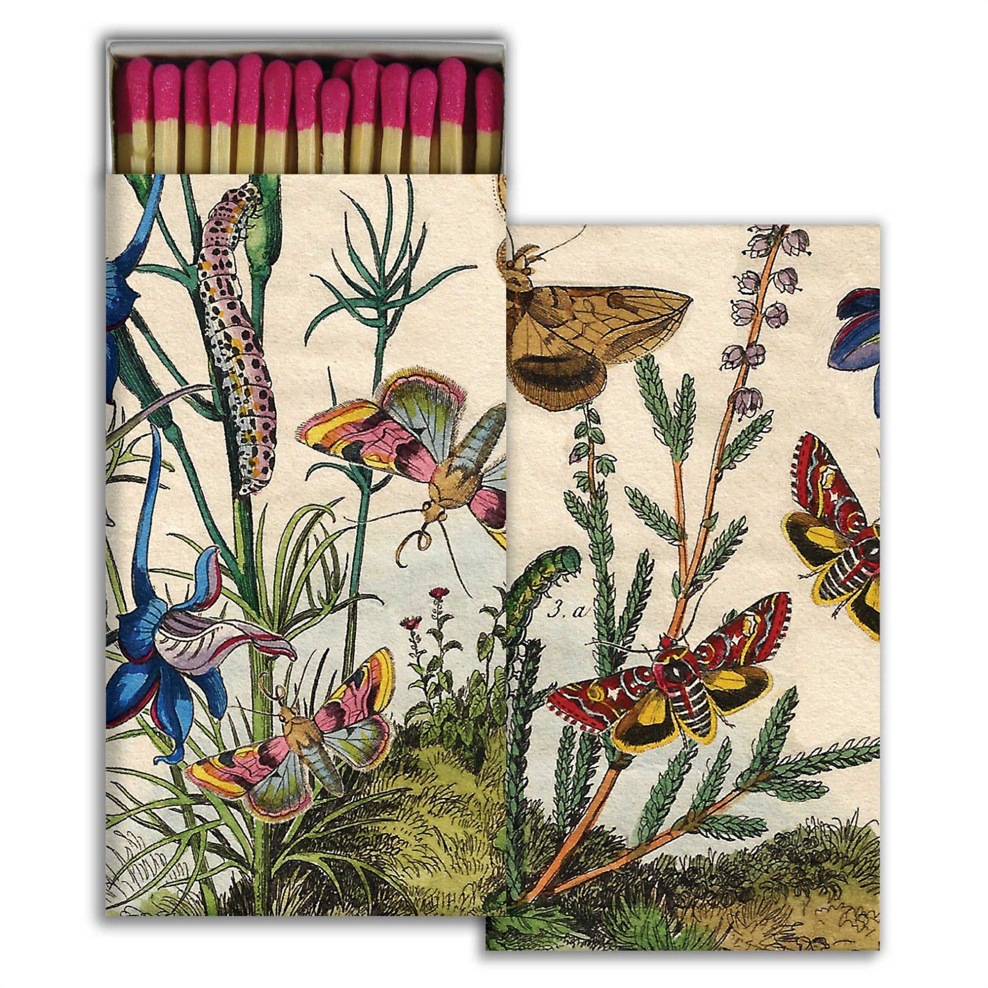 Beauty in the Prairie takes form, as colorful butterflies flutter, coaxing the lonesome caterpillar to join them in flight soon. Pair this matchbox and its magenta tipped matches with your favorite candle. Makes a nice Hostess gift or Wedding Favor. Safety matches, 50 sticks per box.