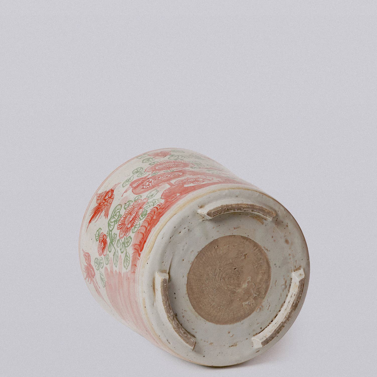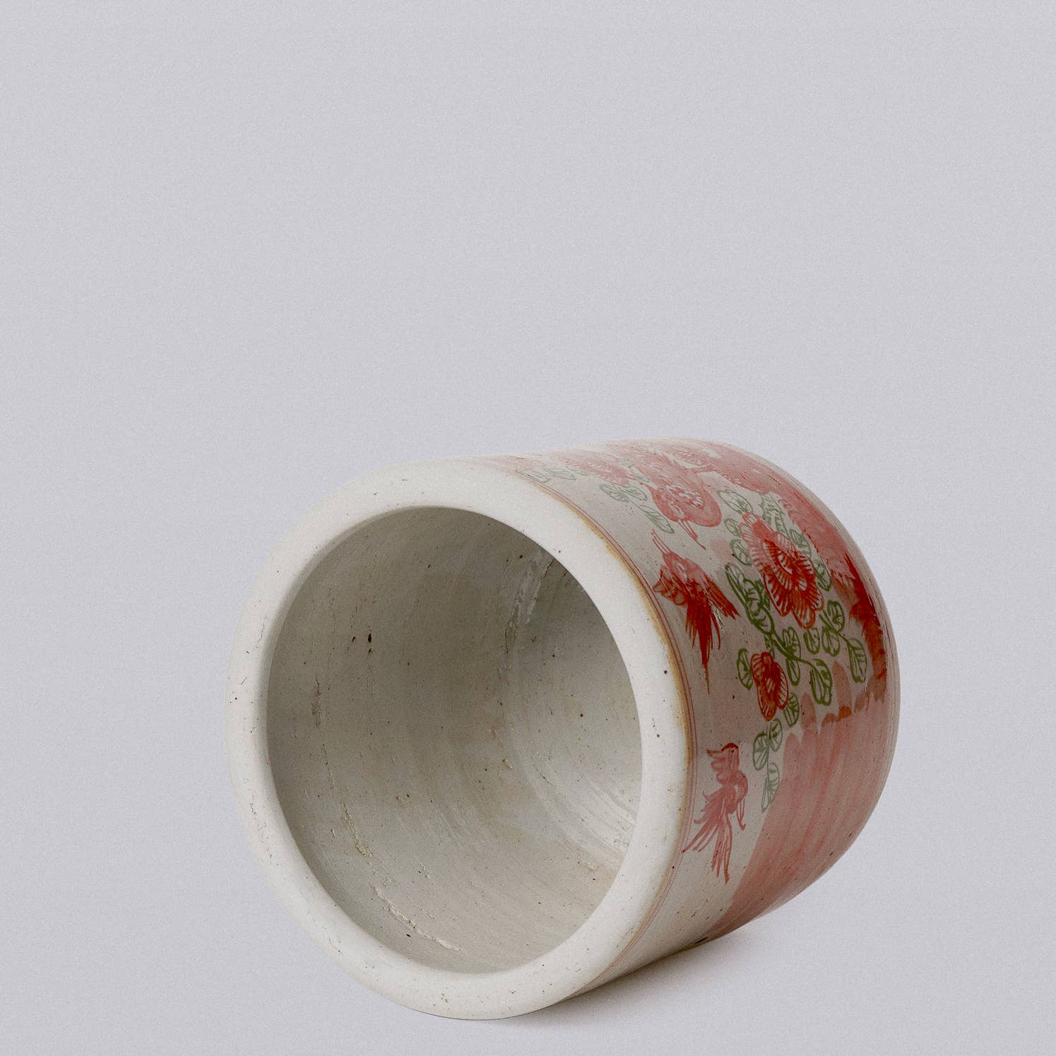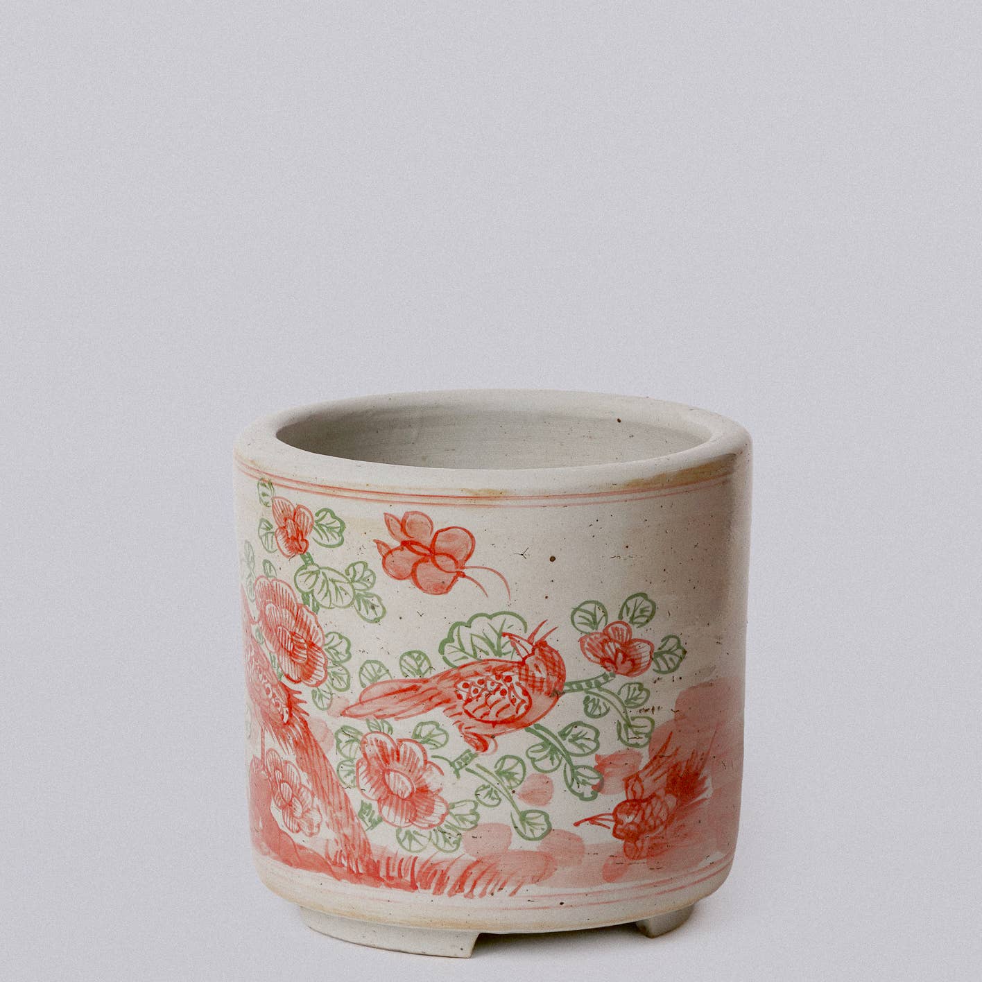 Pink and Green Porcelain Bird and Flower Footed Cachepot