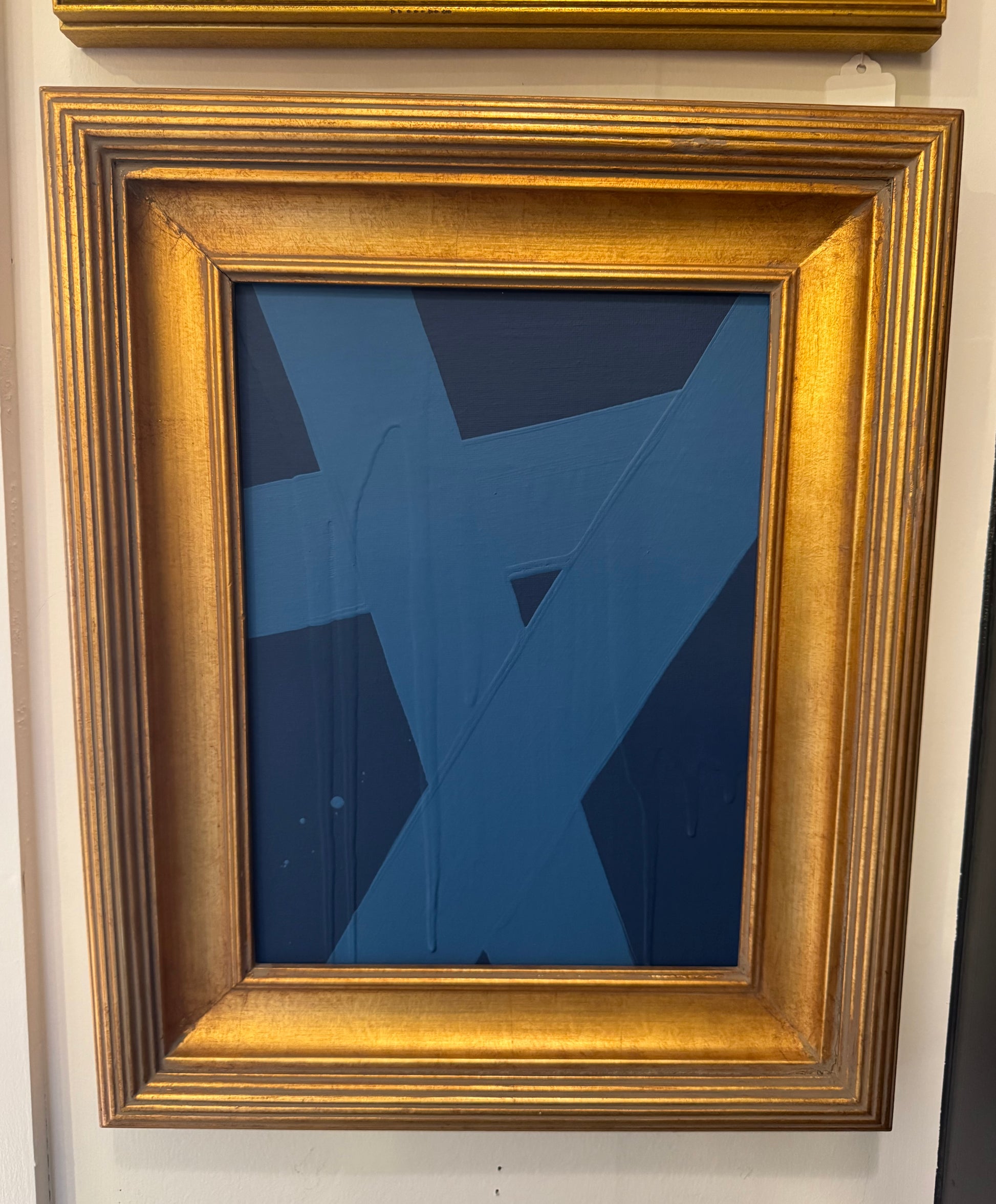 Ron's inspiration for this series comes from his love of how simple shapes can say more than words. Graphic and bold. Each one is hand-painted with heavy strokes of acrylic on canvas board. The colors mix perfectly with the classic wood antiqued gilt gold foil frame and look beautiful standing alone, in a grouping or mixed and matched on a gallery wall. Each frame is finished by hand to look vintage with an aged patina. Original art is 8 x 8 with a finished framed size of 11.5 x 1.5 x 11.5. Each one is signed on the back.