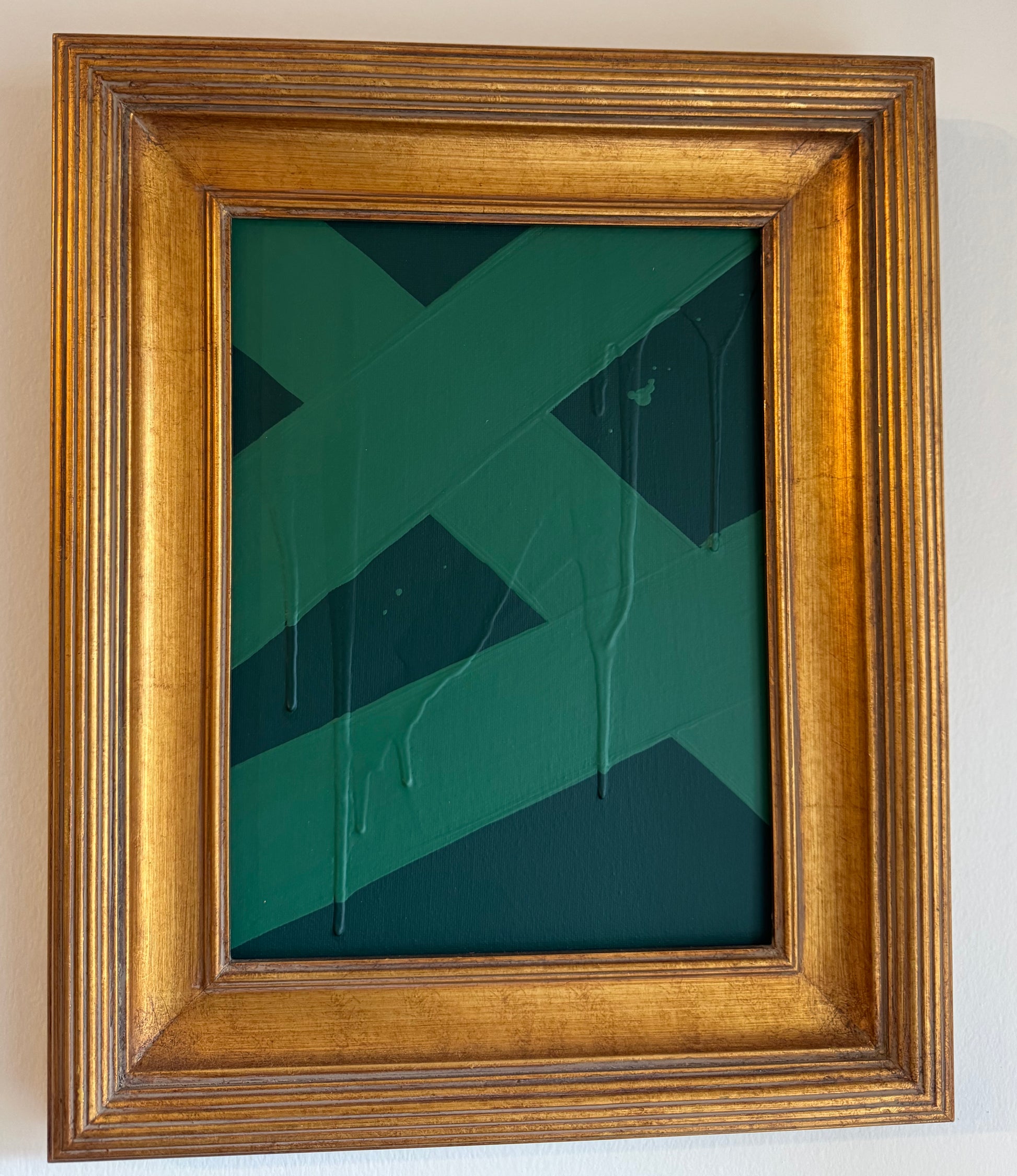 Ron's inspiration for this series comes from his love of how simple shapes can say more than words. Graphic and bold. Each one is hand-painted with heavy strokes of acrylic on canvas board. The colors mix perfectly with the classic wood antiqued gilt gold foil frame and look beautiful standing alone, in a grouping or mixed and matched on a gallery wall. Each frame is finished by hand to look vintage with an aged patina. Original art is 8 x 8 with a finished framed size of 11.5 x 1.5 x 11.5. Each one is signed on the back.
