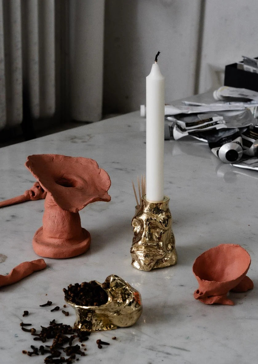 "The monsters have accompanied the work over the years. Sometimes as metaphors and figures in the story I'm working on. From the beginning in text form, in later years as wooden sculptures or clay figures. Model clay in the breaks when painting. A bit sloppy and hasty with just the hands. It fits well, they are such monsters, careless and not so scary, often sad. Quite loving. Depressed monsters. The collaboration with Skultuna has many good reasons apart from Skultuna's willingness to cast my clay figures".
