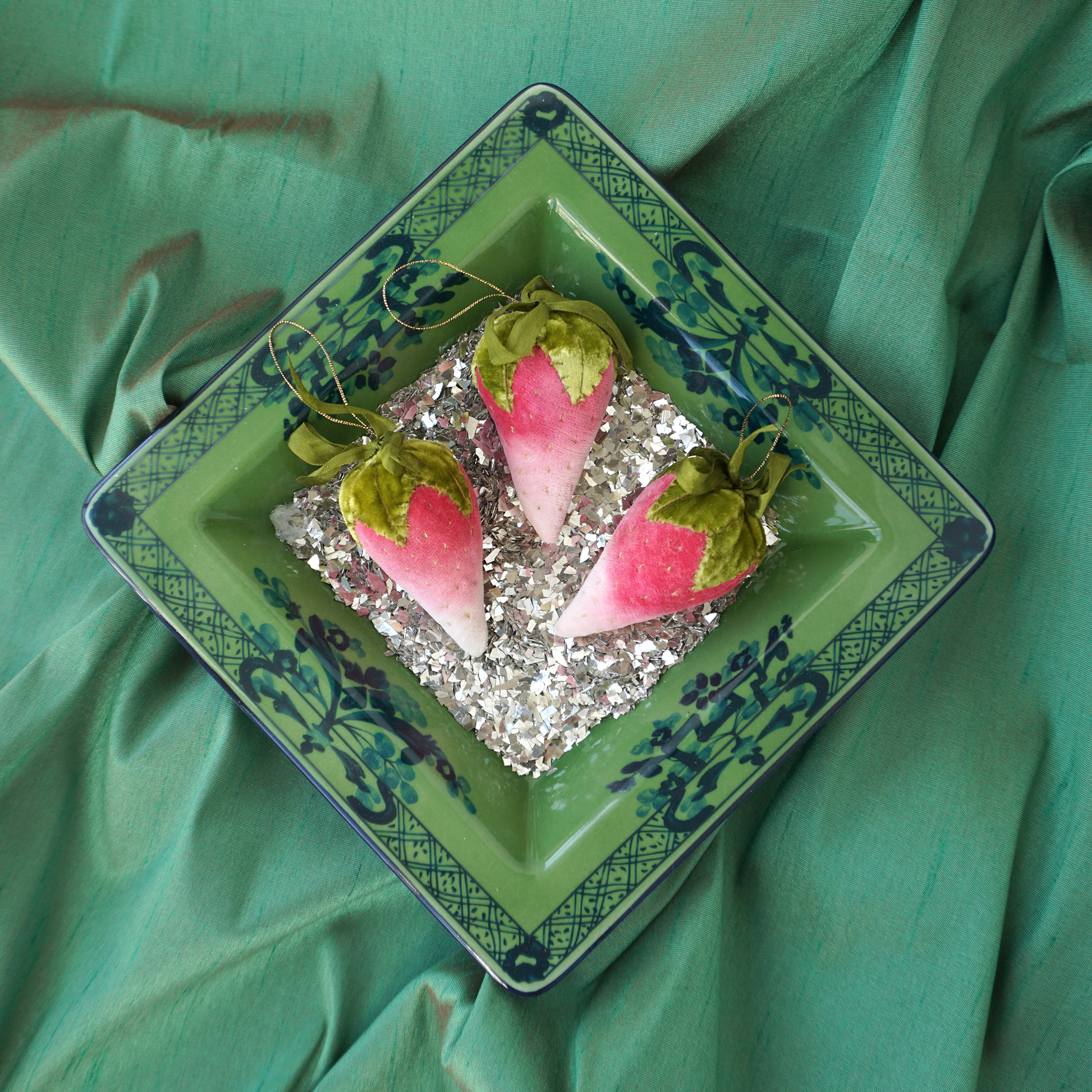 Velvet strawberry pincushion measures approx. 2.5 inches tall.